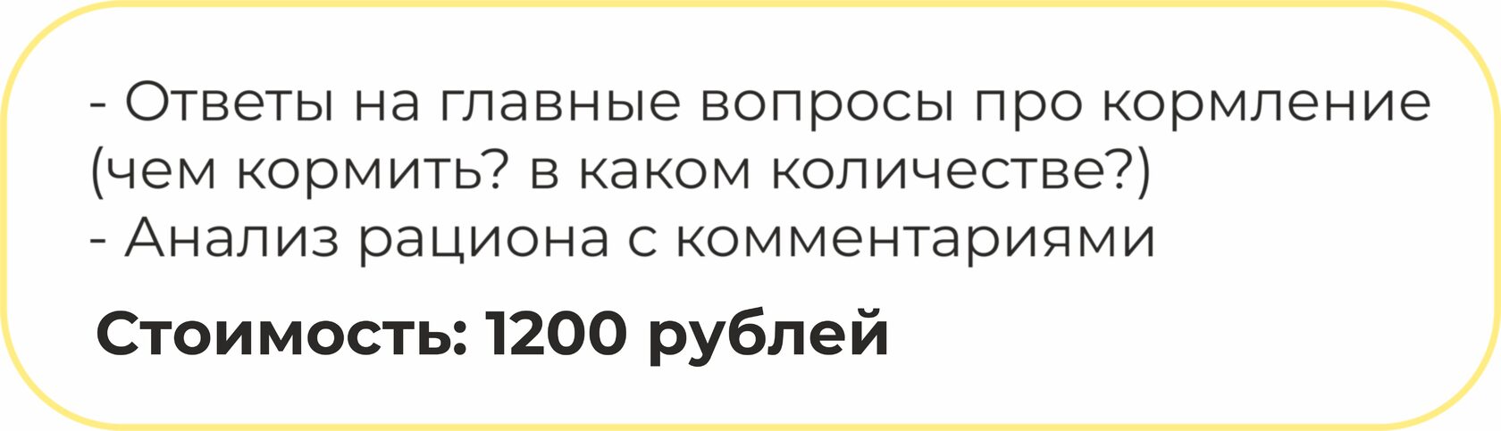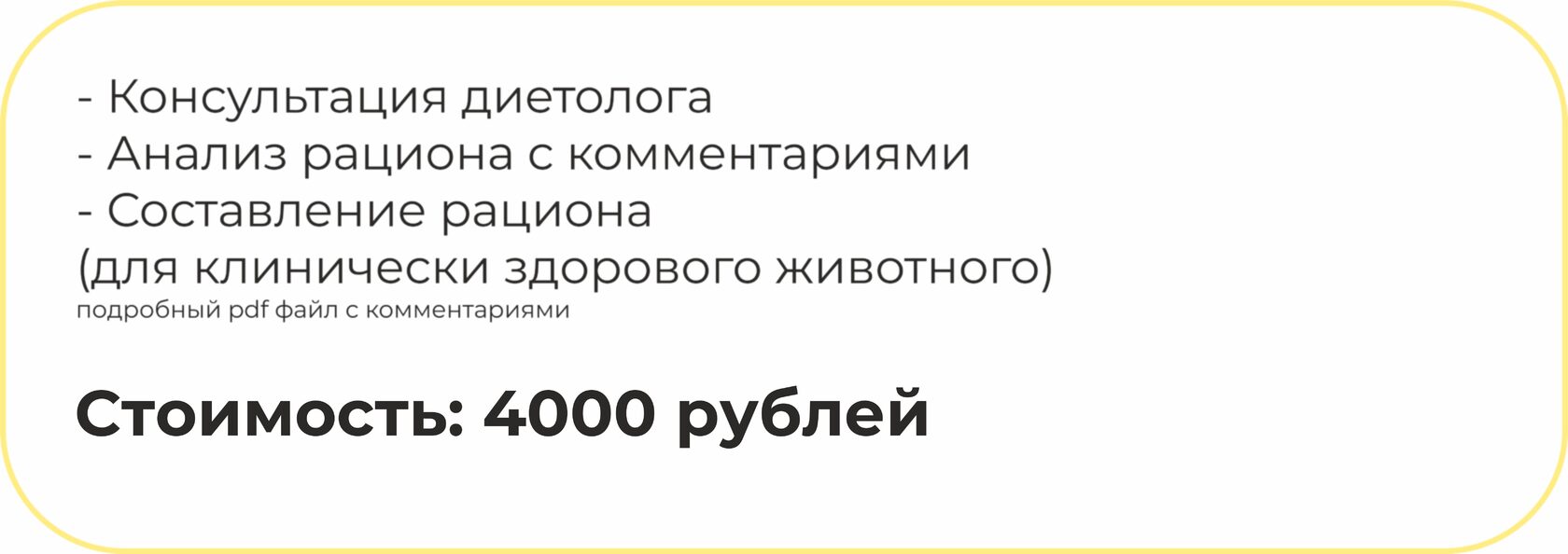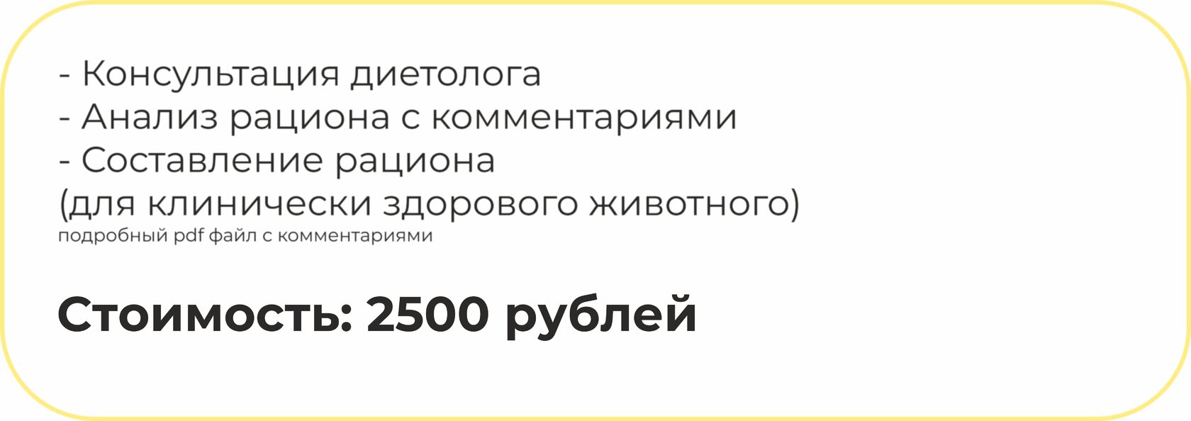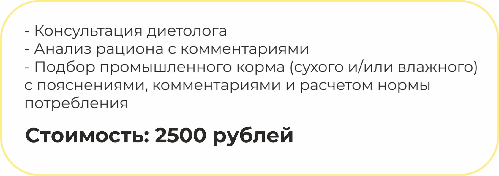 Врач диетолог индивидуально составляет рацион для вашего питомца, учитывая возрастные, породные и репродуктивные особенности организма.